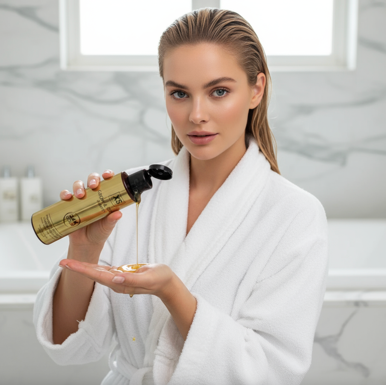 Започнете с шампоана. Нанася се върху мокра коса и скалпът се масажира нежно 2-3 минути до получаване на пяна, след което се отмива обилно с вода. Може да се повтори за по-добро измиване на косата.